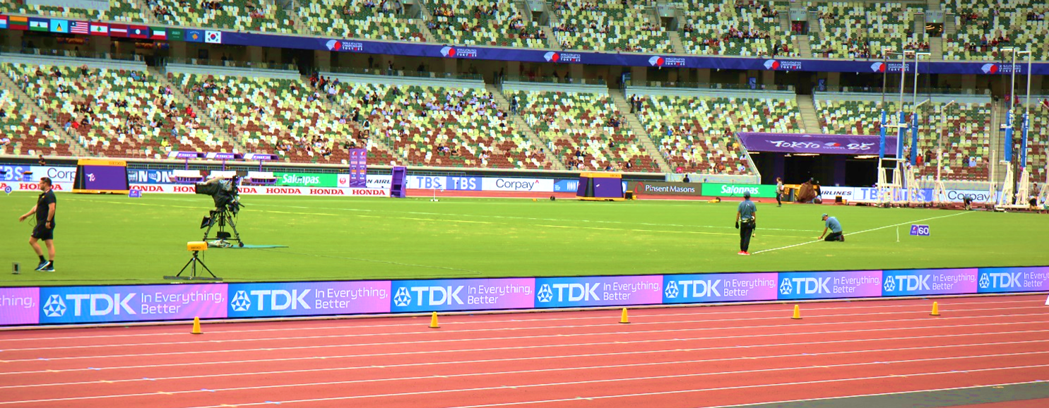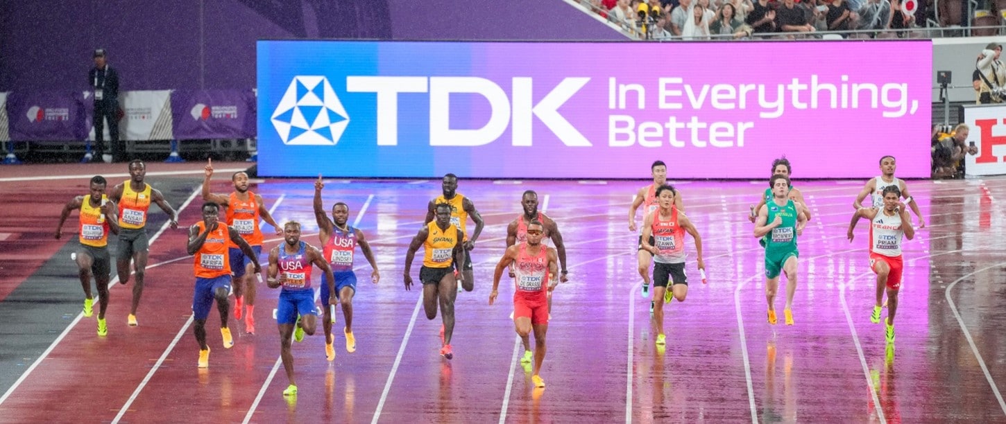 TDK has been an official partner of the World Athletics Championships since they began, and ever since the second championships in Rome, the TDK banner has been displayed behind the starting line.