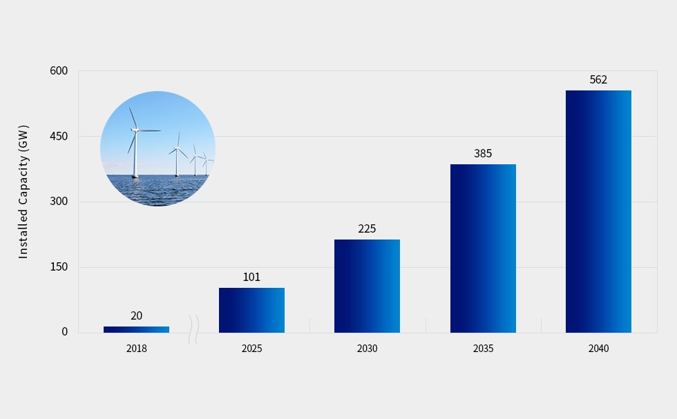 Globally, the offshore wind power market is expected to continue growing, reaching 562 gigawatts (562 million kilowatts) by 2040.