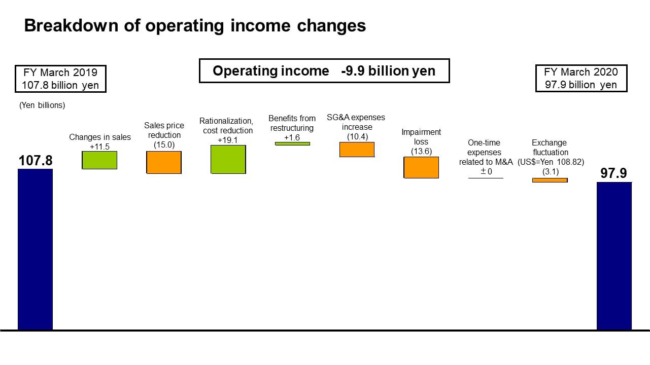 Next is the breakdown of the change in operating income. Let’s take a look at the main factors behind the 9.9 billion yen decrease in operating income. First, there was an increase in profits of about 11.5 billion yen due to sales volume growth, despite including negative impact of about 12.0 billion yen from the spread of COVID-19.