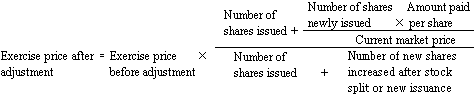 In case the Company issues new shares or disposes of its own shares at a price less than the current market price (except in the case of the conversion of convertible stock or stock with mandatory conversion terms, or in the case of a request by a stockholder for the sale of shares constituting less than one unit or the exercise of stock acquisition rights), the exercise price shall be adjusted in accordance with the following formula and any amount less than one yen arising out of such adjustment shall be rounded up to the nearest yen: