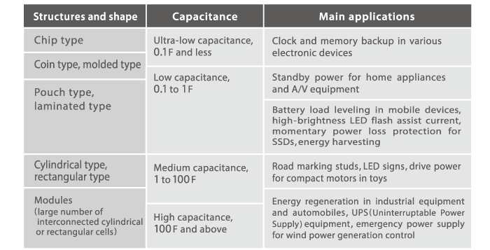 Electric double layer capacitors are divided into the following categories, according to their construction and shape. Sizes range from small chip and coin type products to large modules combining many interconnected cylindrical or rectangular cells.