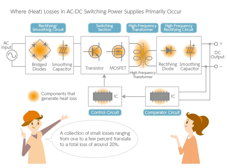 An AC-DC switching power supply used as a power supply for electronic devices consists of (1) an AC-DC front end (rectifying and smoothing circuit) that obtains DC current from 100V commercial AC power, and (2) a DC-DC converter section (including stabilizing circuitry) that converts the obtained DC current to the needed voltage. Despite being much more efficient than linear systems, the efficiency of AC-DC switching power supplies is generally only around 80%. Individual circuit components typically have losses of about one to a few percent, but collectively they translate to an overall efficiency of approximately 80%.