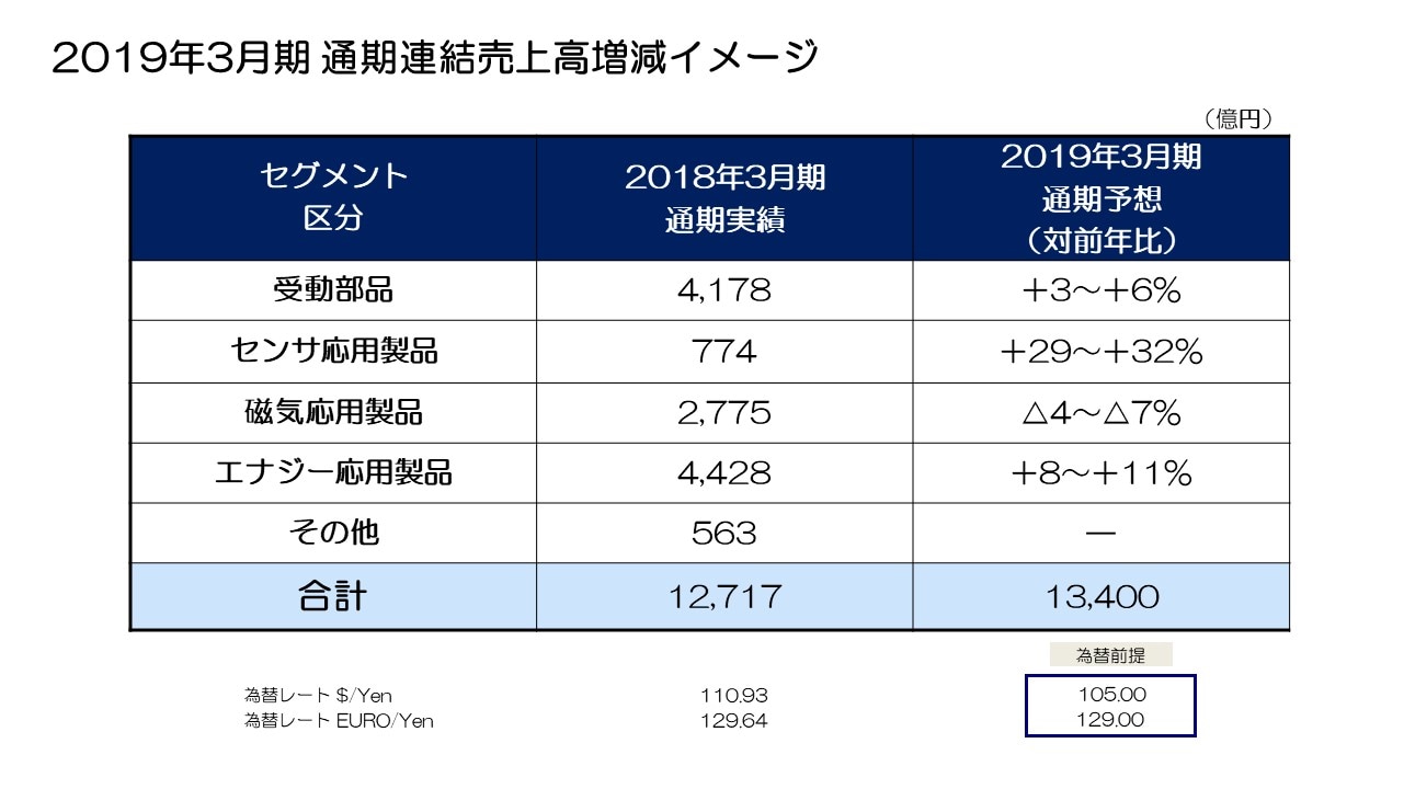 様々な電子部品需要の拡大が進行するなか、基盤事業の受動部品が想定される市場の成長以上に増加すること、センサ応用製品は買収効果を実現するステージとなり売上拡大に貢献してくること、エナジー応用製品においても堅調に成長を続けることで、全社で着実に成長していくイメージと捉えていただきたいと思います。
