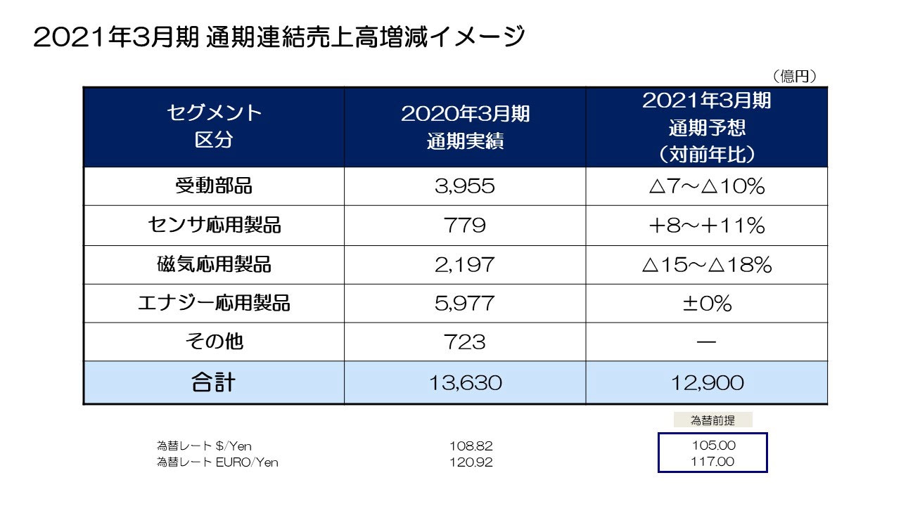 ただ今ご説明した世界経済動向、および主要セットの需要予測に基づき、2021年3月期の連結業績をご覧の通り予測しています。