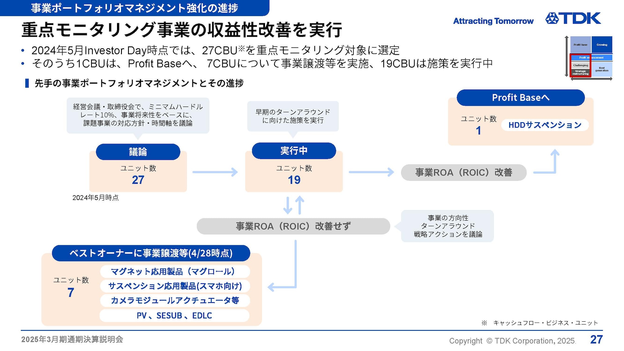 2024年5月以降、27のCBUについて議論、早期のターンアラウンドに向けた施策を検討・実行してきた結果、HDDサスペンションは、すでにターンアラウンドを達成しました。また、HDDヘッドについてもその方向にあります。