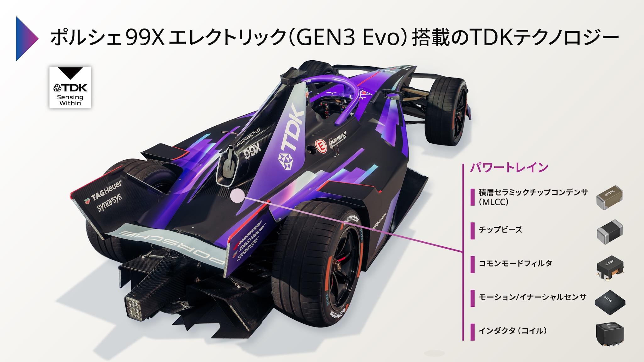 ポルシェ99Xエレクトリックのインバーターの性能を最大限に引き出し、過酷なレース環境下での信頼性を確保するために、TDKの最先端コンポーネントが重要な役割を果たしています。各製品の役割と、最新モデル「GEN3 Evo」への貢献についてご紹介します。
