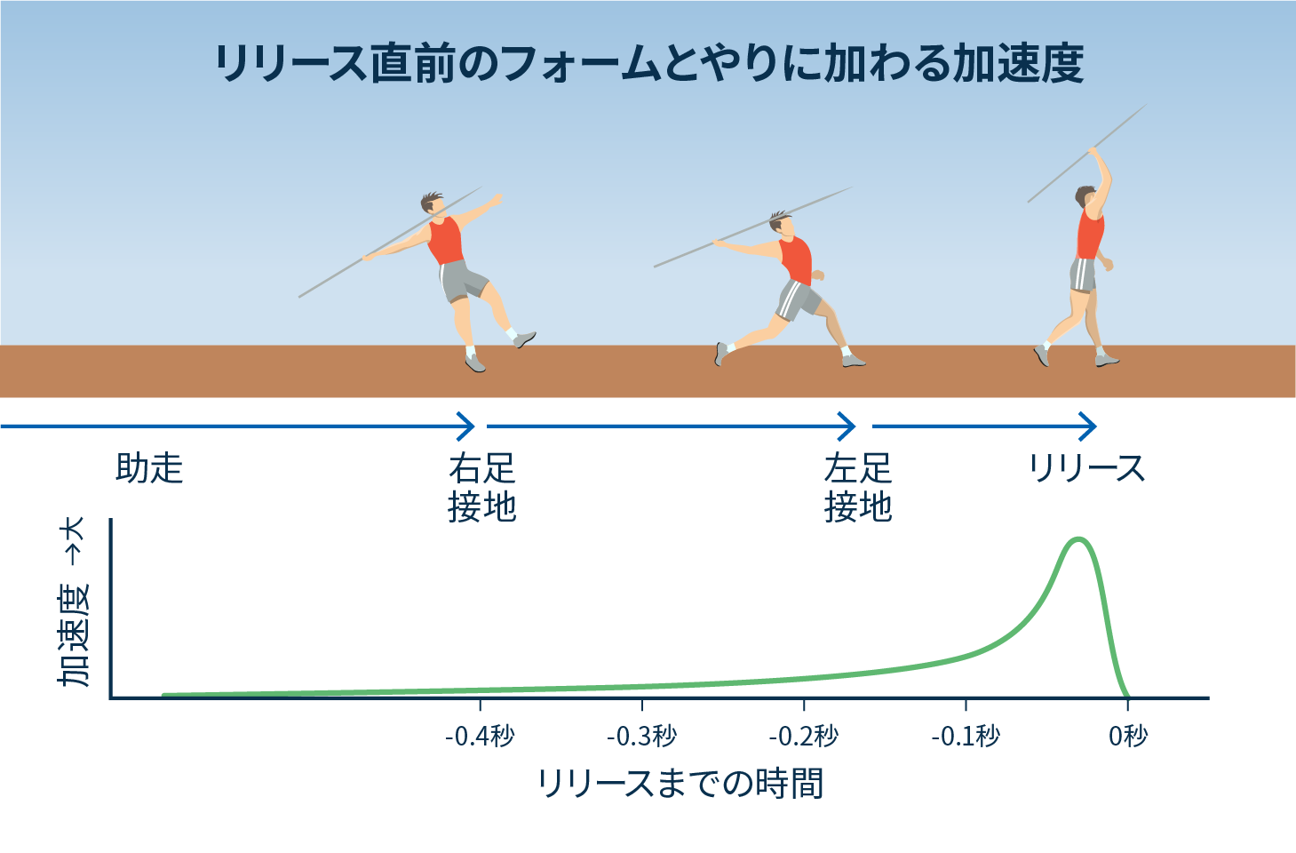 加速度センサを取り付けたやりを用いた投てき実験と解析によると、以下のグラフのように、リリース前の約0.1秒でやりに加わる加速度は急激に上昇し、加速度曲線の最高値が高いほど飛距離が伸びます。したがって、助走で蓄えられた運動エネルギーと筋肉エネルギーの双方を無駄なくやりに移すフォームとリリースのタイミングがポイントとなります。