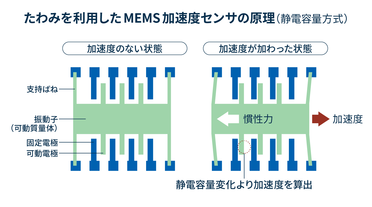 いずれもシリコン基板上に支えられた振動子と、くし形の可動電極および固定電極で構成されます。たとえば、MEMS加速度センサは、加速度が加わったときの振動子の“たわみ”による電極間の静電容量の変化を検知して加速度を算出します。これはコンデンサマイクにも応用されている静電容量方式という原理です。MEMS加速度センサの基本原理を以下に示します(図は簡略化したもので、実際の構造はもっと複雑です)。