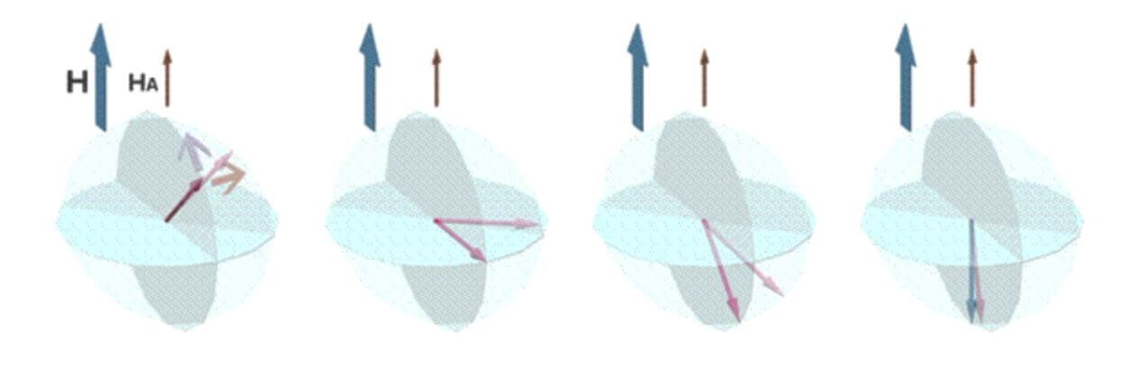 交流磁界を加えられたとたん、磁壁中に並ぶ磁気モーメントは首振り運動を起こす。その過程を、磁壁全体を通して眺めてみたのが、このモデルである。磁気モーメントの回転を表現するために、これまで立方体で描いてきた単位胞を球体として描いてみた。左の3つの球体が磁壁中の単位胞で、一番右側の1つが磁区の最端部に位置する単位胞という設定である。そして、HA方位に微弱な交流磁界を印加し、磁壁が単位胞1列分だけ右方へ移動する様子を追ってみた。 このモデルにおける最大のハイライトは、単位胞の磁気モーメントが、そもそも何故に、xy平面から頭を持ち上げ、回転運動を始めるのか、であるが、じつは、くるくると回転しながら斜めに着地したコマの首振り運動と、ご覧いただいている磁気モーメントの首振り運動とは、基本的に同じ理屈に支配されている。コマに働いた地球の引力の作用と、上の球体モデルにおける交流磁界の"引力"を等価と考えれば、一見複雑そうにy軸を巡る赤い矢印にも古典力学の規律がしっかり利いている様子が見えてくる。