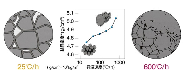 左のグレインモデルに示すとおり、ゆっくり焼成すると、グレインを仕切る粒界層に巨大な空孔が生成され結晶密度は著しく低下する。そこで、それではと、その逆を攻めてみると、右側のグレインモデルに示すとおり、結晶密度は上がるものの、粒径に著しいバラつきが生じ、しかも空孔だらけという最悪のグレインに仕上がってしまうのである。