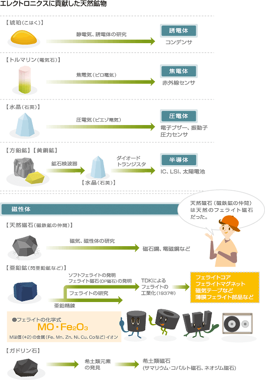 1930年、東京工業大学の加藤与五郎博士と武井武博士により発明されたフェライトもまた、閃亜鉛鉱など鉱石から亜鉛を取り出す工法の研究から誕生した電子材料です。亜鉛鉱石を焼いて酸化亜鉛としたのち硫酸で溶かし、これを電気分解すると亜鉛が得られますが、このとき鉱石に含まれる鉄酸化物が亜鉛と結合してフェライトとなります。亜鉛の収率を下げるやっかいな存在であったフェライトの研究をしているとき、偶然にも強い磁性を示すフェライトがあることが発見されたのです。こうして誕生したのが世界初のフェライト磁石であるOP磁石です。ほどなく両博士は軟磁性材料のフェライト(ソフトフェライト)も発明しました。その特許を譲り受けて工業化し、“オキサイドコア” という商品名で販売したのがTDKです(1935設立。当時の社名は東京電気化学工業)。
