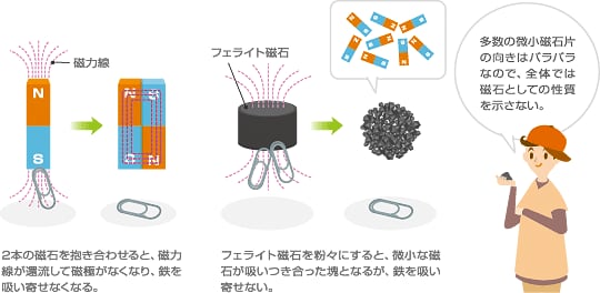 2つの棒磁石を磁極を反対向きに抱き合わせると、鉄を吸い寄せなくなります。これは磁力線が磁石内部を還流するようになり、磁極が外部に現れなくなるからです。フェライト磁石を粉砕すると、砕片のそれぞれが微小磁石となり、互いに吸いついて団子状になります。団子状になったフェライト磁石は、やはり鉄を吸い寄せなくなります。これもまた、多数の微小磁石がバラバラの向きで互いに吸いつきあっているためです。