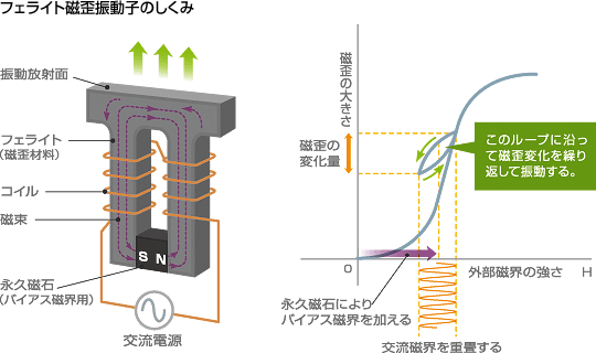 磁歪による寸法変化はわずかなものですが、初磁化過程の中間あたりで交流磁界を加えると、寸法変化を繰り返して磁性体は振動します。この振動を外部に取り出して利用するのが磁歪振動子です。磁歪振動子は磁性体にコイルを巻いたもので、コイルに高周波電流を加えると超音波振動を発生する磁歪振動子となります。しかし、ニッケルなどの金属材料は電気抵抗が小さいため、高周波の磁界を加えるとエネルギー損失が大きくなってしまいます(渦電流によるジュール熱の発生)。かたや磁性セラミックスであるフェライトは電気抵抗が大きいので、渦電流損失が小さく、磁歪振動子として利用されるのです。