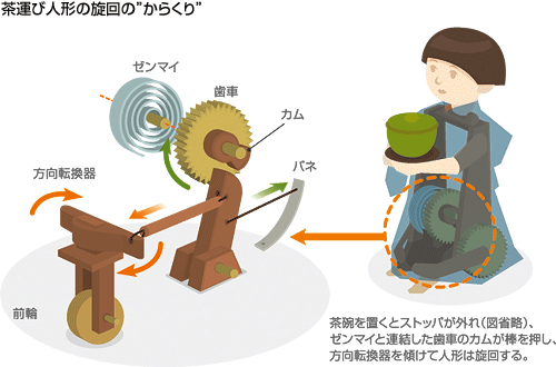 茶運び人形のいちばんの仕掛けは、客が茶碗を持ち上げると停止し、再び茶碗を置くと旋回して戻っていくところにあります。茶運び人形はゼンマイ仕掛けの三輪車です。ゼンマイの動力は歯車から動輪に伝えられて走行し、茶碗を持ち上げるとストッパがかかって停止。茶碗を置くとストッパが解除されるとともに、歯車と連結したカムが前輪の方向転換器を押しまわして旋回するという仕組みです。
