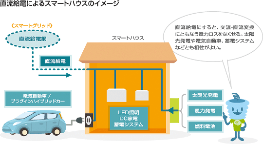 給電そのものを交流から直流に変えようという構想も練られています。電子機器のほとんどが直流で稼動し、LED照明も直流が使われるので、家庭やオフィス、データセンターなどには、直流給電した方が交流-直流変換にともなう電力ロスを削減できて効率的です。また、太陽光発電、バッテリ蓄電、電気自動車やプラグインハイブリッドカーなども、直流給電と相性がよいからです。このため、将来的にスマートグリッドは直流給電が導入されるとも予測されています。