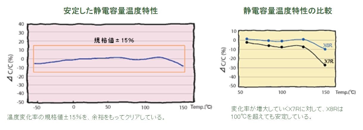 積層セラミックチップコンデンサは、使用温度環境によって、静電容量が変化しやすい。このため、ある温度範囲を設定して、その範囲内における静電容量の変化を、どこまで許容するかが決められている。たとえばX5Rという規格では、温度範囲-55〜+85℃において、静電容量の変化率が±15%と定められている。X7Rが、温度範囲-55〜+125℃(準高温領域)で、静電容量変化率±15%。今回とりあげたX8Rは、温度範囲がより高温領域まで広げられ、-55〜+150℃において、静電容量変化率が±15%である。TDK製品は、このX8R規格を余裕をもってクリアしている。積層セラミックチップコンデンサとしては、最高レベルのタフネス設計である。