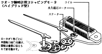 アナログ・クオーツ時計に利用されているのは、PM型とVR型の長所を取り入れたハイブリッド型と呼ばれるステッピングモータです。腕時計に組み込むためにはきわめて小型のものが要求されるため、高い磁気エネルギーをもつ永久磁石が不可欠です。また、高い精度とともに電池の消耗を低減するうえでもハイブリッド型が向いているわけです。