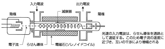 進行波管とはその名が示すように、電波を進行波のまま通過させる間に、陽極から放出される電子流との干渉により、いわば電波をプッシュしながら増幅させる方式です。しかし、電波の速度は電子流とくらべて速すぎるため、そのままでは電波と電子流とは干渉できません。つまり、プッシュしようにも、「暖簾(のれん)に腕押し」のようになってしまいます。そこで、高電圧によって電子流の速度を上げるとともに、電波の通路として、らせん状の導体が用いられます。電波をらせん状に迂回させることによって、直進する電子流の速度に近づけるのです。