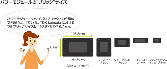電源装置には取り扱いが簡単でコンパクトなモジュール製品としたものが多用されています。これはパワーICや周辺の制御回路を1つのパッケージにまとめたもので、“パワーモジュール”と呼ばれます。パワーモジュールの多くは“ブリック”と呼ばれる規格サイズで製品化されています。ケースに収められた直方体の形状をブリック(レンガ)に見立てたもので、フルブリックはタバコよりやや大きめのサイズです(TDK-Lambdaにおいては、長さ116.8mm、幅61mm、高さ12.7mm)。また、その1/2、1/4、1/8、1/16のサイズは、それぞれハーフブリック、クォータブリック、エイスブリック、シックスティーンスブリックと呼ばれます。