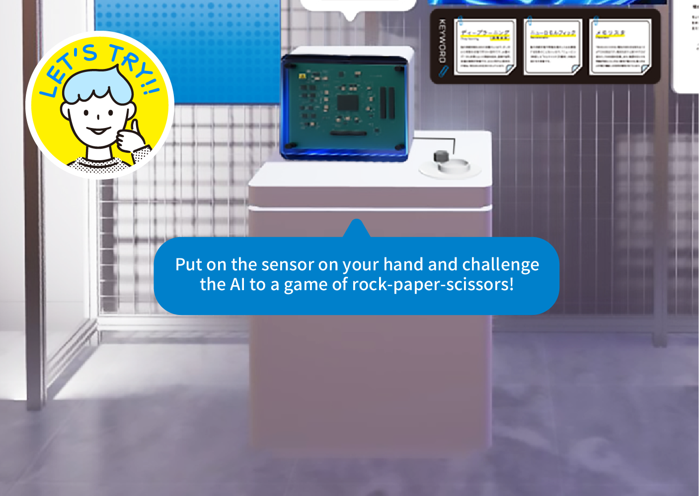 In this game of rock-paper-scissors, sensors attached to your fingers measure your finger movements, and AI predicts your move so that it never loses. The AI is powered by an analog circuit reservoir AI chip that is able to learn even with low power consumption.