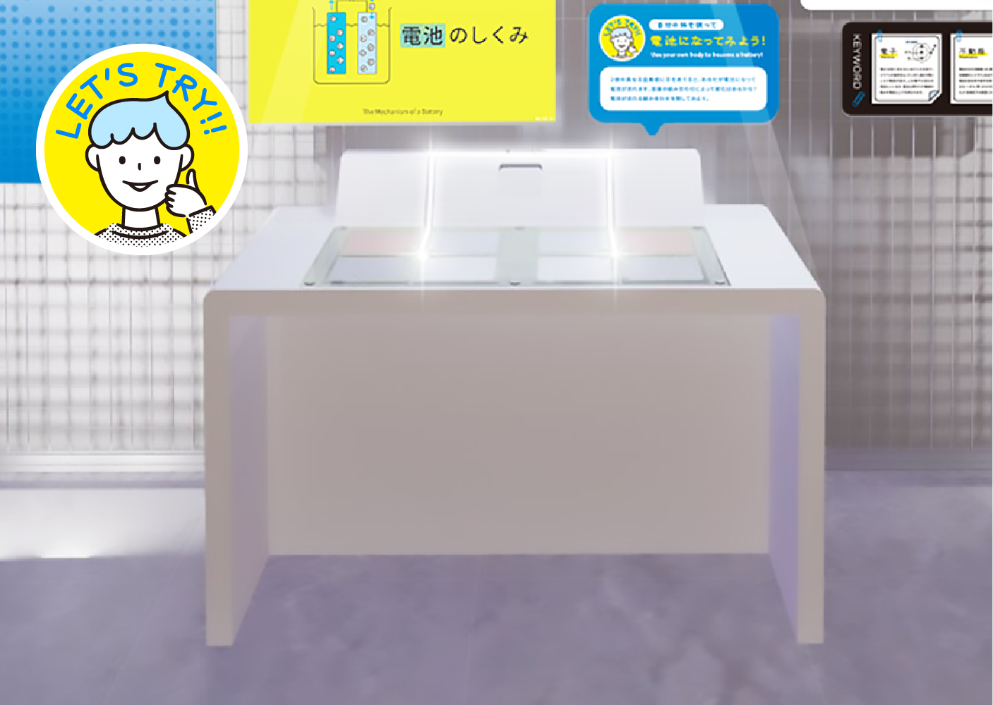Batteries are a familiar and essential source of energy in our lives. A battery uses a chemical reaction to generate electricity and outputs that electricity externally. This exhibit explains the mechanism of batteries and the different types of batteries.