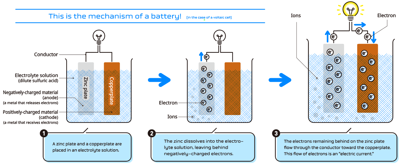 When positive and negative electrodes made from two different types of metals are immersed in an electrolyte solution and connected, metal ions from the negative electrode dissolve into the electrolyte solution and electrons move through the conductor to the positive electrode. Electricity is generated from this reaction.