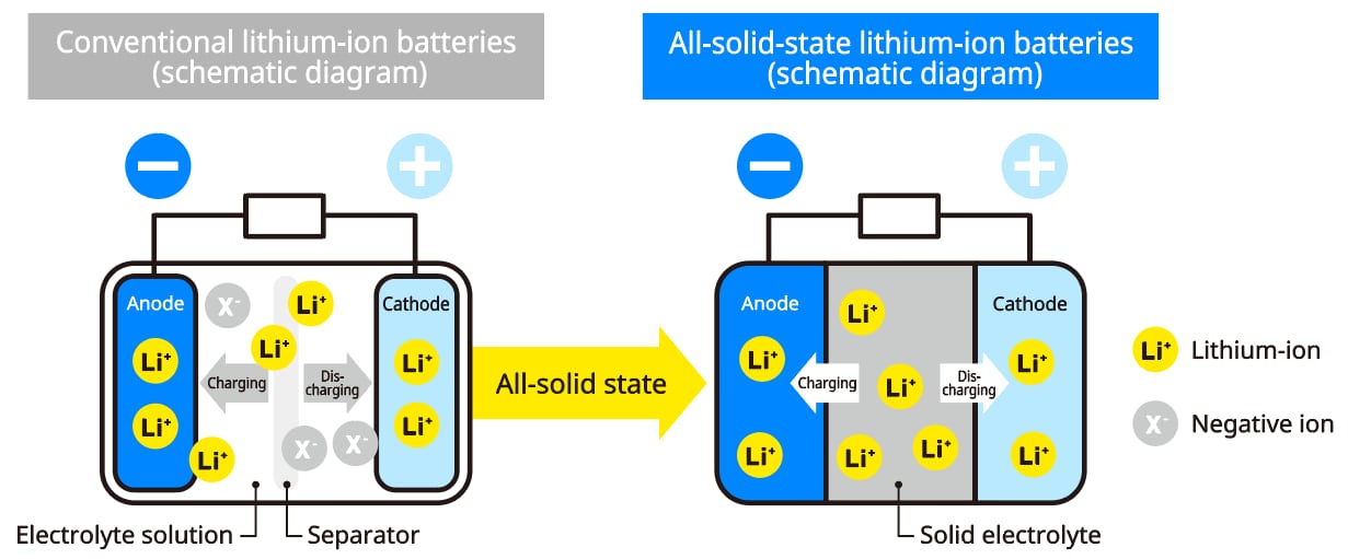 If the contents of a battery can be made solid, the battery will be safer, have a longer lifespan, and be more resistant to heat. It is thought that in the future, high-capacity batteries, such as those used in electric vehicles, will be replaced by all-solid-state batteries.