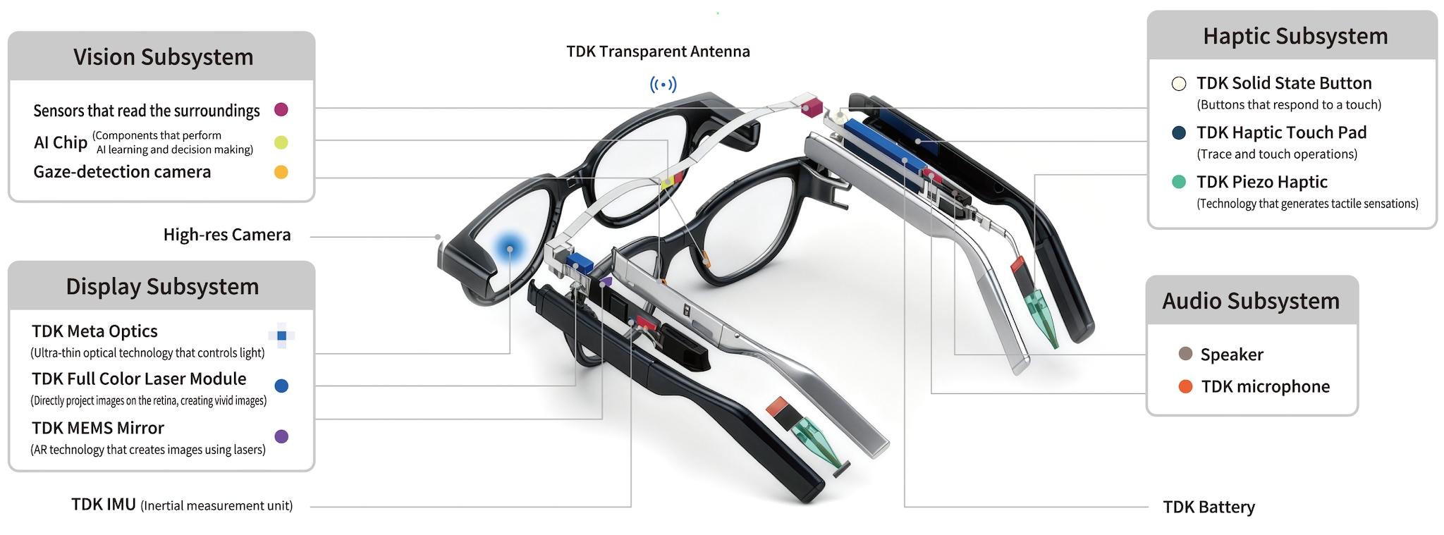 TDK seeks to create an unprecedented smart glasses experience by combining laser modules, sensors, microphones, batteries, and other components as well as software.