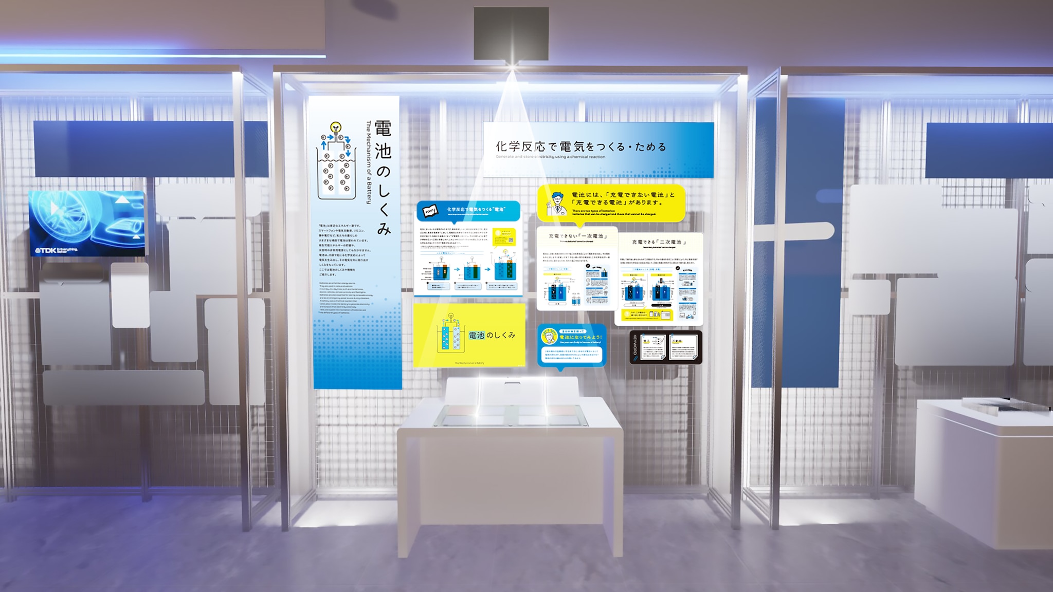 暮らしに欠かせない身近なエネルギー源である電池。化学反応によって電気を生み出して、外へ取り出すしくみを持っています。この展示では、電池のしくみやさまざまな種類をご紹介します。