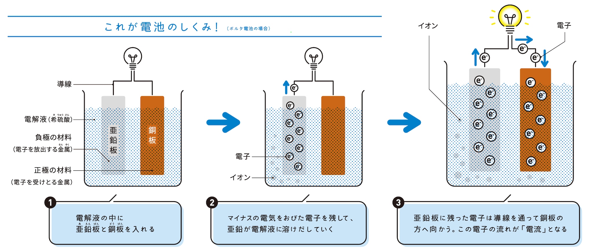 正極と負極の2種類の金属を電解液に浸して接続すると、負極から金属のイオンが電解液に溶けだし、電子が導線を伝って正極に移動します。この反応から電気が生まれます。