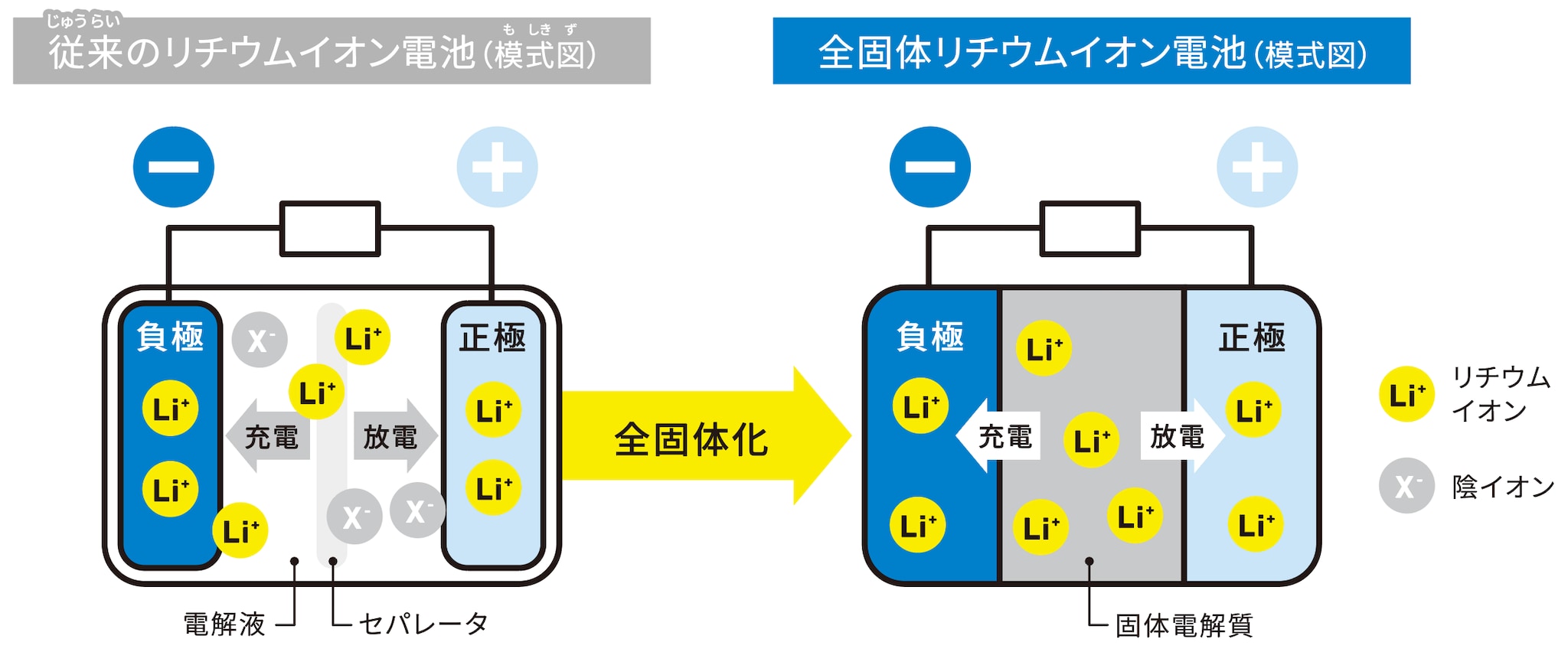 電池の中身が液体から固体になると、安全で長寿命、熱にも強くなります。将来的には、電気自動車などの大容量バッテリも全固体電池に置き換わると予想されています。