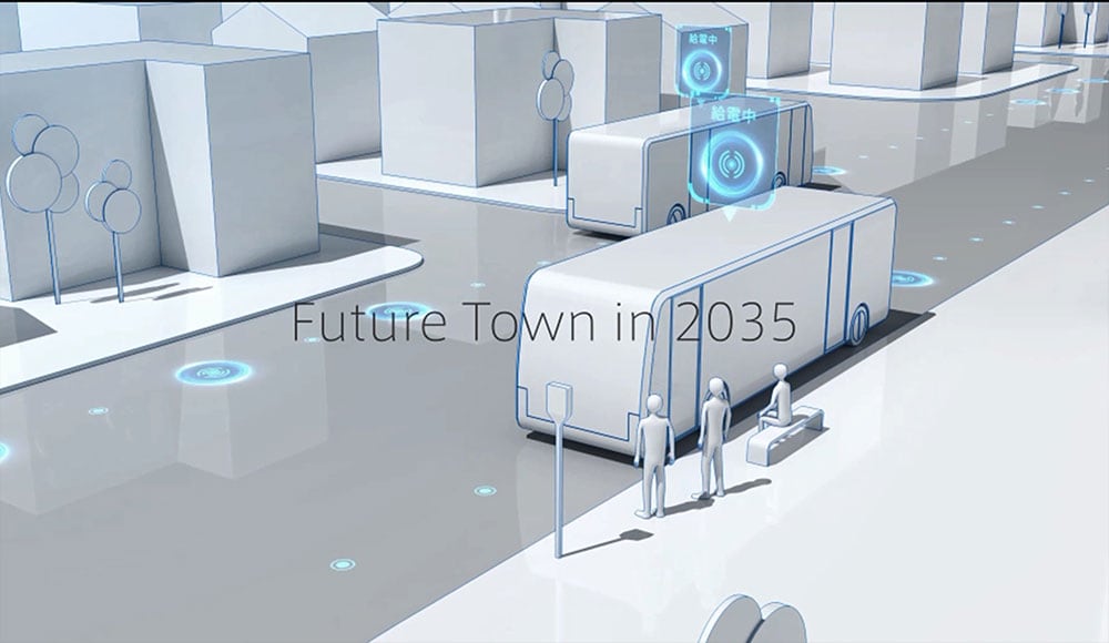 道路を見ると電気自動車や運転手のいない自動運転のバスが走っています。この道路には非接触給電システムが整備されていて、この上を電気自動車が走ることで自動的に充電されているのです。