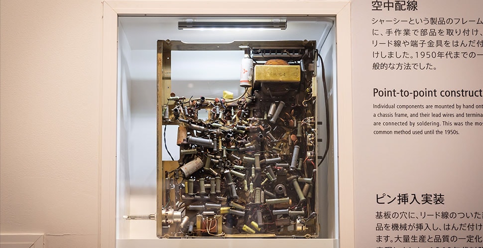 昔の家電の中(空中配線)は、様々な部品が手作業ではんだ付けされています。こんなに多数の配線が複雑にこんがらがっており、大きな部品が入っていたのだと驚くでしょう!