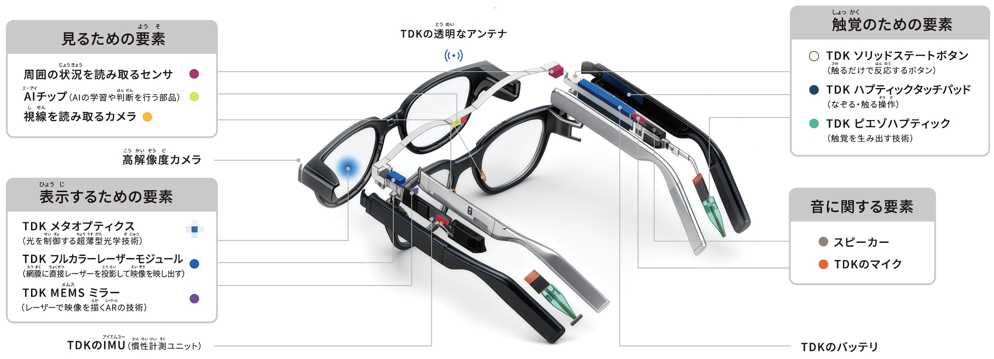 TDKは、レーザーモジュール、センサ、マイク、電池などの部品とソフトウェアを組み合わせることで、これまでにないスマートグラス体験の実現を目指しています。