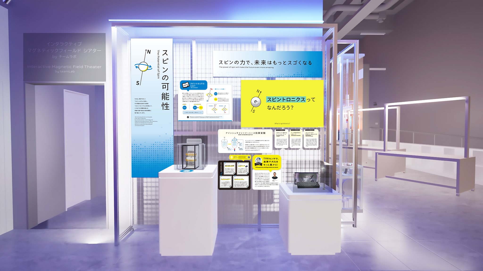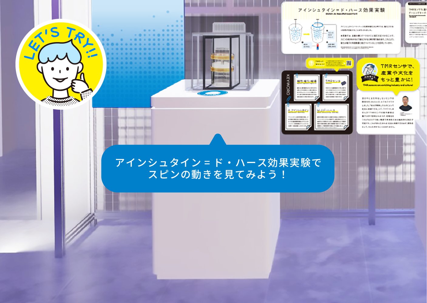 電子の「スピン」を目に見えるように示したのが、アインシュタイン=ド・ハース効果実験です。この展示では実験装置を再現。金属の棒(パーマロイ)に磁石を近づけることで、スピンの向きがそろい、棒が回ることを確かめることができます。