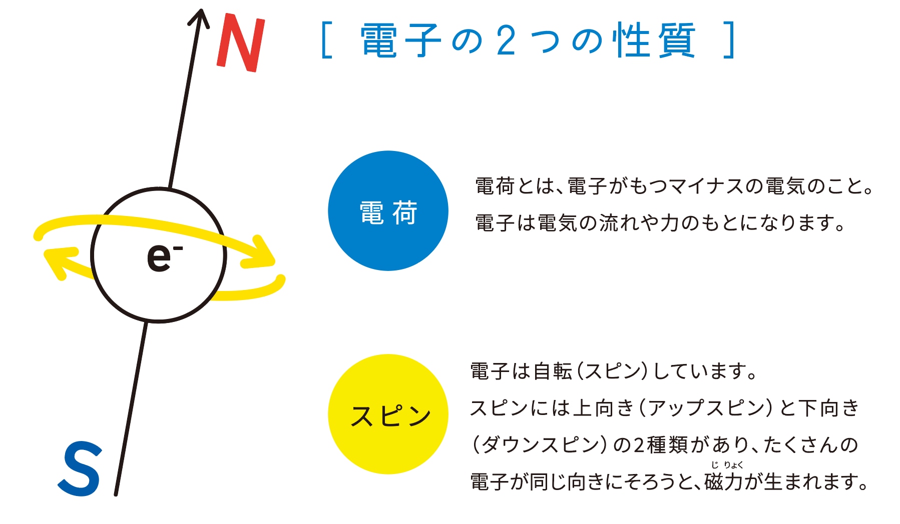 電子には「電荷」と「スピン」という2つの性質があります。電子が持つ小さな磁石のような性質(スピン)も利用することで、少ない電気で速く動き、電源を切っても情報が消えにくい電子機器を実現できます。