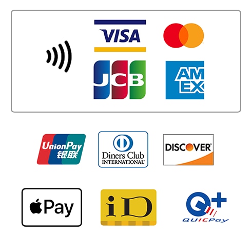 QUIC Pay、Apple Pay、iD、交通系電子マネー(Kitaca、PASMO、Suica、manaca、TOICA、ICOCA、はやかけん、nimoca、SUGOCA)、Union Pay、Alipay、微信支付、Coin+、d払い、Pay Pay、LINE Pay、au Pay、Jcoin、楽天ペイ
