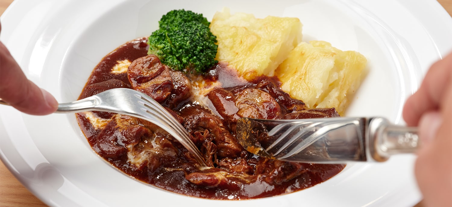 秋田県産由利牛のすね肉や肩肉などを長時間煮込み、お箸で切れる位やわらかく仕上げています。ソースには秋田味噌を隠し味に使用して深みのある味わいに仕上げています。付け合わせのジャガイモのグラタンは生クリームを使いクリーミーでコクがありおすすめです。